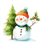 Cartoon snowman with scarf and hat on frosty festive Christmas greeting card