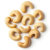 Close-up of natural raw cashews arranged on a white background