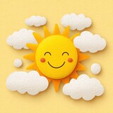 Smiling sun surrounded by fluffy white clouds on a bright yellow background