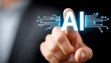 Businessman pointing at AI icon surrounded by futuristic digital networks