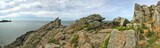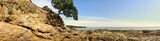 Rocky coastal panorama with tree and blue sky in scenic landscape header format