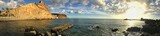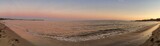 Panoramic view of a quiet beach and shoreline during a colorful sunset