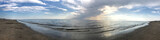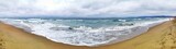 Wide panoramic view of a sandy beach and tranquil ocean waves
