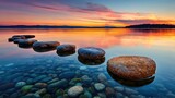 Stepping stones in a tranquil lake at sunset with vibrant sky