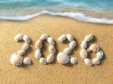 Seashells arranged to form year 2026 on a sandy beach with ocean waves