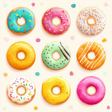 Colorful doughnuts with various glazes and toppings displayed on a white background