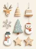 Set of wooden Christmas ornaments featuring festive designs on white background