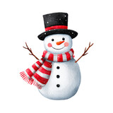 PNG watercolor snowman with black top hat and red scarf, cheerful winter character for holiday scenes