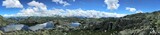 Panoramic view of alpine landscapes with reflective lakes and rugged terrain