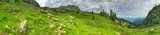 Panoramic view of lush alpine landscape with mountains and vibrant greenery