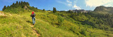 Panoramic view of hiker trekking through a vibrant mountain trail landscape