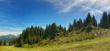 Scenic mountain panorama with lush forest and blue sky in sunny daylight