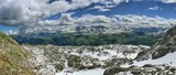 Panoramic view of a rocky alpine landscape with mountains and cloudy blue skies