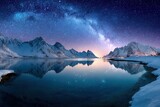Starry night over peaceful snowy mountains and tranquil reflective lake