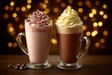 Cozy mugs of hot chocolate topped with whipped cream and festive décor