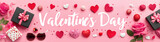 • Valentines Day Banner With Gift Boxes Roses Hearts And Sunglasses On Pink Background For Romantic Celebration