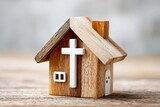 Miniature Wooden House With White Cross Symbol On Wood Surface For Church Faith Religion And Home Concepts Close Up View