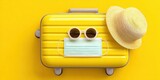 Yellow Suitcase With Hat Sunglasses and Mask on Yellow Background for Travel and Vacation During Pandemic Times