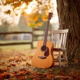 Acoustic guitar resting on a chair under a tree during autumn sunset