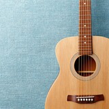 Close-up of an acoustic guitar against a textured blue fabric surface