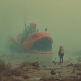 Adventurer Confronts Gigantic Mechanical Fish in Post-Apocalyptic Landscape