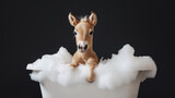 Adorable foal sitting in bathtub surrounded by white soap foam bubbles