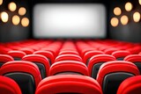 Empty movie theater with red seats and a bright blank screen, creating a calm cinema atmosphere