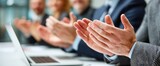 Business meeting scene with people in suits clapping hands around a laptop at the table