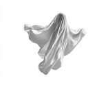 Ethereal ghost shrouded in white cloth floating on a stark white background