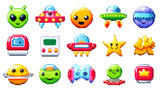PNG Pixel Art Game Assets With Alien Spaceship Star Emoji And Console On Dark Background For Retro Gaming And App Development