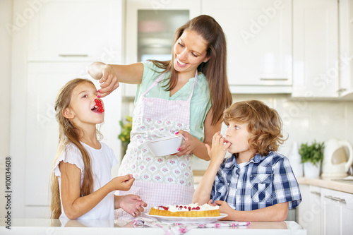 Mother and children baking cake together