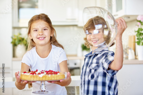 Stolz präsentieren zwei Kinder einen Obstkuchen