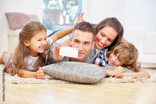 Familie mit zwei Kindern hat Spaß und macht Selfie