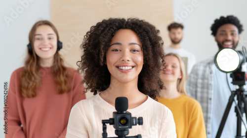 Smiling group of influencers recording a live video in creative studio setting. #1002426116