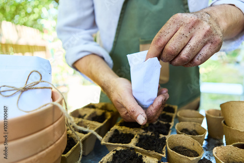 Gardener planting seeds in biodegradable pots during a sunny day in the garden