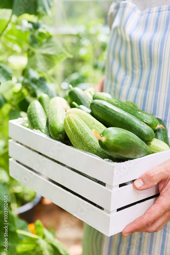 Gardener holding a crate full of freshly harvested cucumbers in a greenhouse