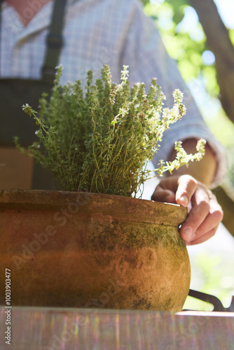 Gardener tending to thyme plants in clay pot during sunny day in garden