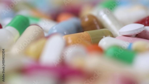 Big pills on pile of colourful medication pills rotating in a seamless loop