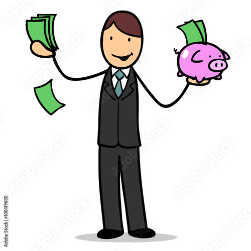 Cartoon Bankkauffrau mit Geld und Taschenrechner