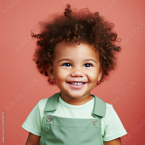Adorable Hispanic toddler with curly hair smiling on pink background