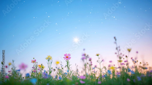 Colorful wildflowers blooming in a field under a bright sunny blue sky