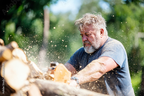 Experienced landscaper using a chainsaw to cut through a large tree trunk