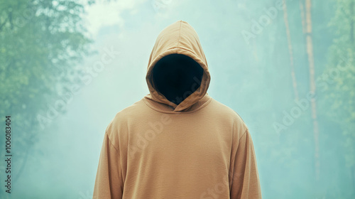 Mysterious figure in brown hooded garment standing in foggy forest evoking a sense of intrigue and mystery