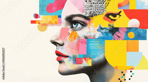 Contemporary art collage featuring a woman's profile with vibrant geometric shapes and textures