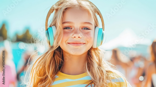 Portrait of a cheerful young lady enjoying music with headphones outdoors on a sunny day.