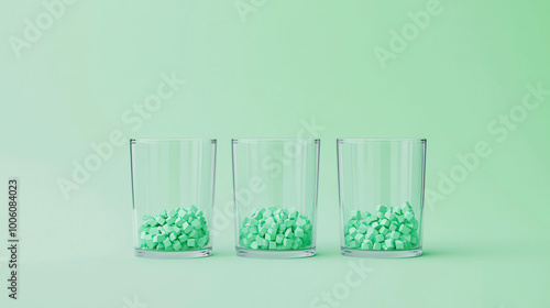 Side view of three glasses filled with green plastic polypropylene pellets on a soft green background, demonstrating industrial material concept and sustainable packaging trends.