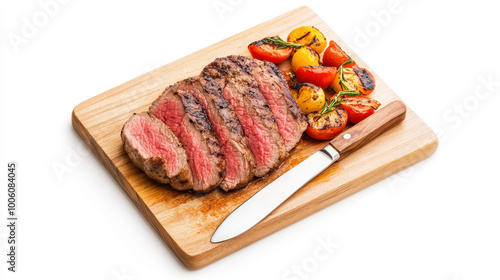 Sliced grilled steak with a knife and roasted vegetables on wooden board showcasing delicious gourmet meal presentation.