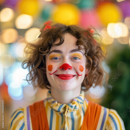 Colorful female clown portrait with joyful vibes and bokeh lights
