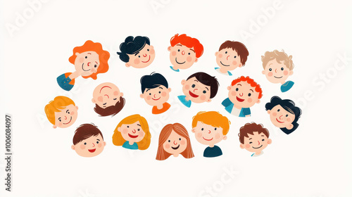Top down view of diverse cartoon faces looking up happily, showcasing bright smiles and playful expressions in a colorful and artistic illustration.