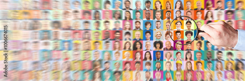 Hand mit Lupe sucht in Portraits als Umfrage und Marktforschung Konzept